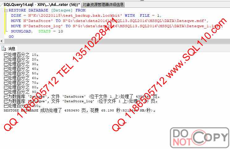 修复结果 使用极佳sqlbakfix修复工具修复被加密的bak备份文件 直接还原到SQL完成恢复,完整度100%
