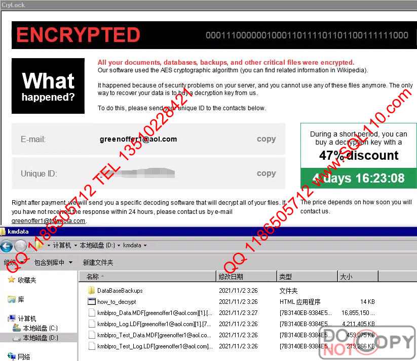 crylock勒索病毒解密 服务器中勒索病毒解密 数据库中greenoffer1@aol......