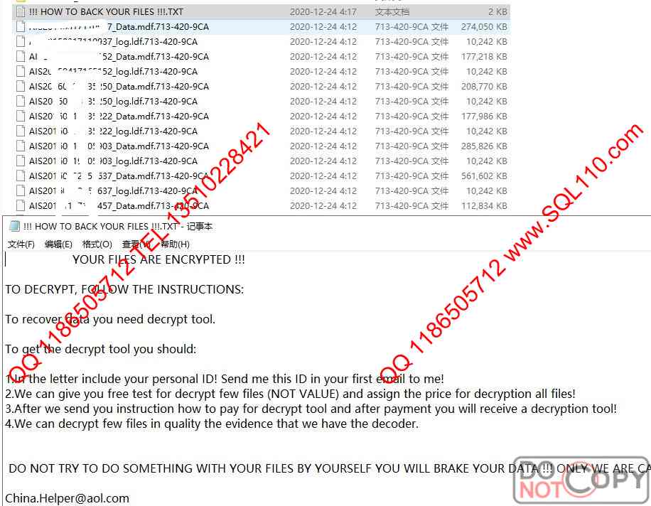 .713-420-9CA勒索病毒解密 服务器中毒解密.713-420-9CA SQL数据库中病毒解密.713-420-9CA