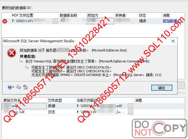 可能发生了架构损坏 请运行 DBCC CHECKCATALOG SQL数据库附加错误 211