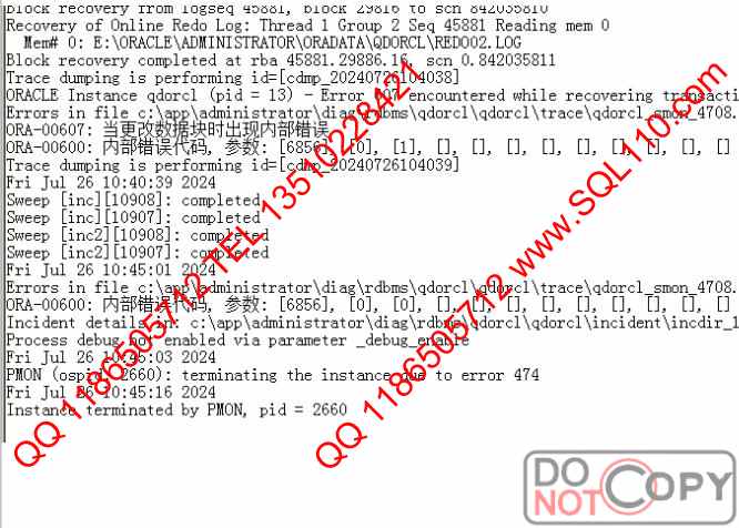 故障类型 oracle数据库服务器异常断电,数据库文件无法启动 0RA-00600错误。