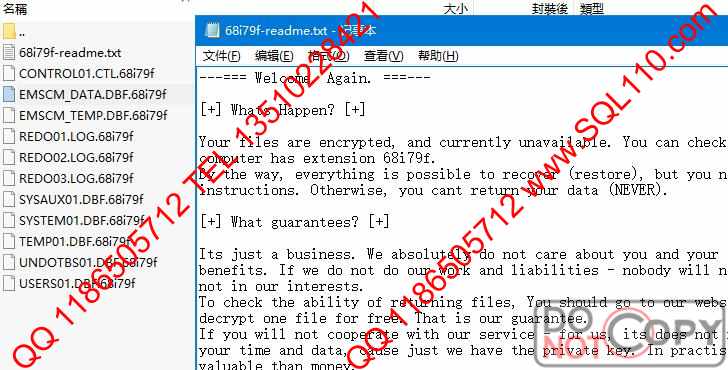 故障类型 服务器中毒,文件被加密。数据库被加密损坏添加了.68i79f扩展名。留下文档内容为