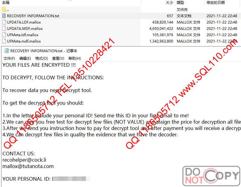 故障检测 服务器被.mallox勒索病毒加密,所有文件被加密.mallox需要恢复U8数据库