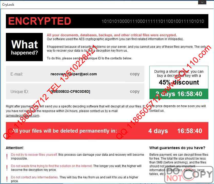 crylock勒索病毒解密恢复 服务器中毒解密 recovery.helper@aol.c......