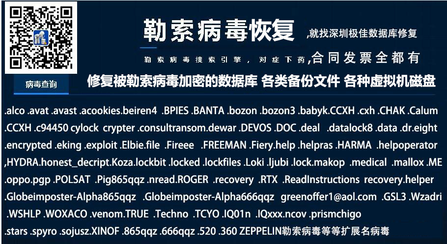 极佳数据库修复中心 日以继夜研究 破解这些被加密的文件,为客户减少损失,目前我们可以处理99.9%的勒索病毒被加密的数据库文件 及压缩包文件 以及VHD VHDX VMDK Veeam备份vbk文件等等虚拟机磁盘等文件。